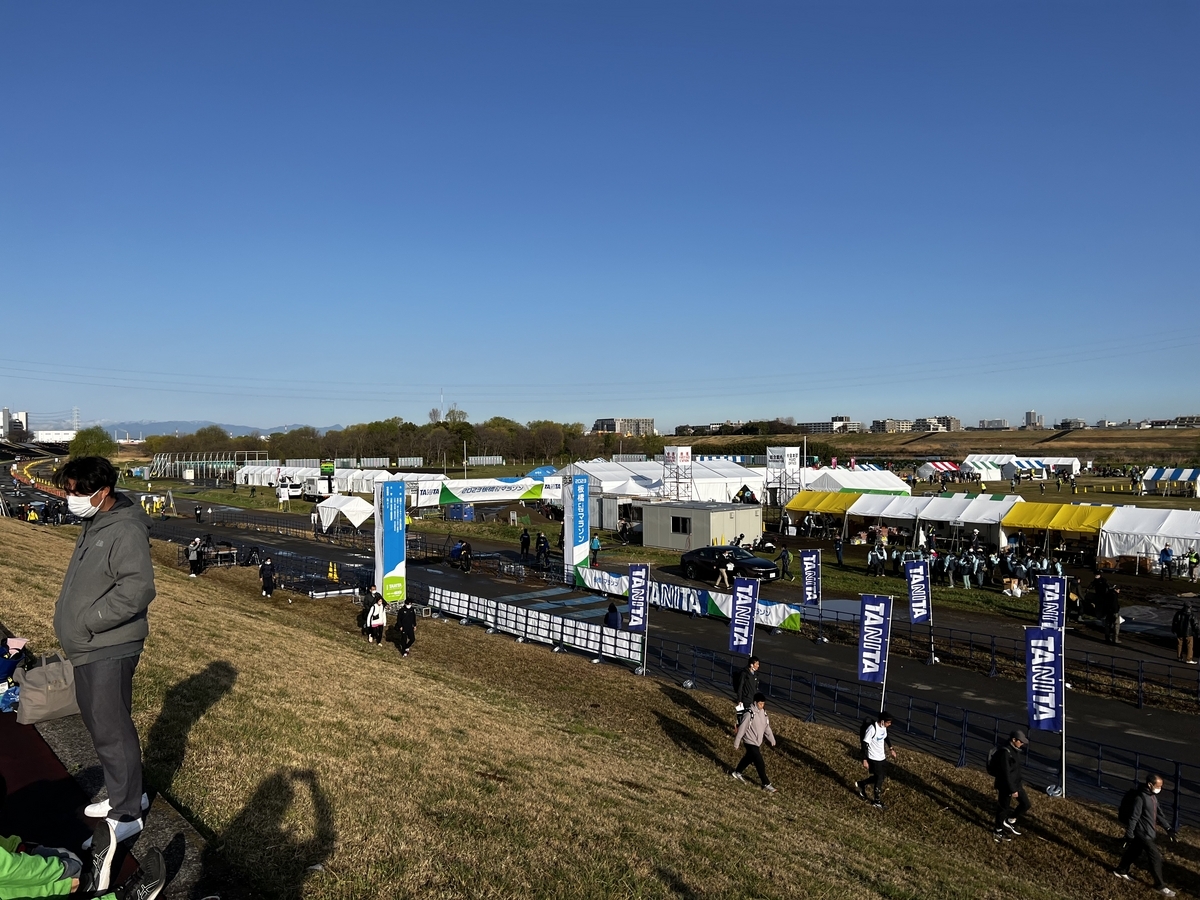 スタート1時間前に雨に濡れる覚悟を決めて、荷物預け→スタート地点へ移動を始める。ついでにトイレに寄ったが、大して混んでおらずさくっと用を足してスタート地点近くの屋根のあるところでまた待機。ここでストレッチを行う。ただスタートまで30分も時間があるのに整列を促され渋々並ぶ。開会セレモニーが粛々と終わり、いよいよスタート。