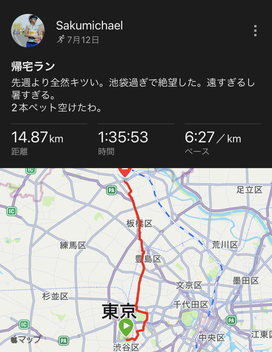 まずは目の前の夏を乗り切る。ペースは上がらないが、週2回のポイント練。そして距離も踏む。夏が終わるころには強くなっているはずと信じて走るしかない。